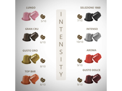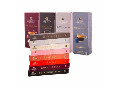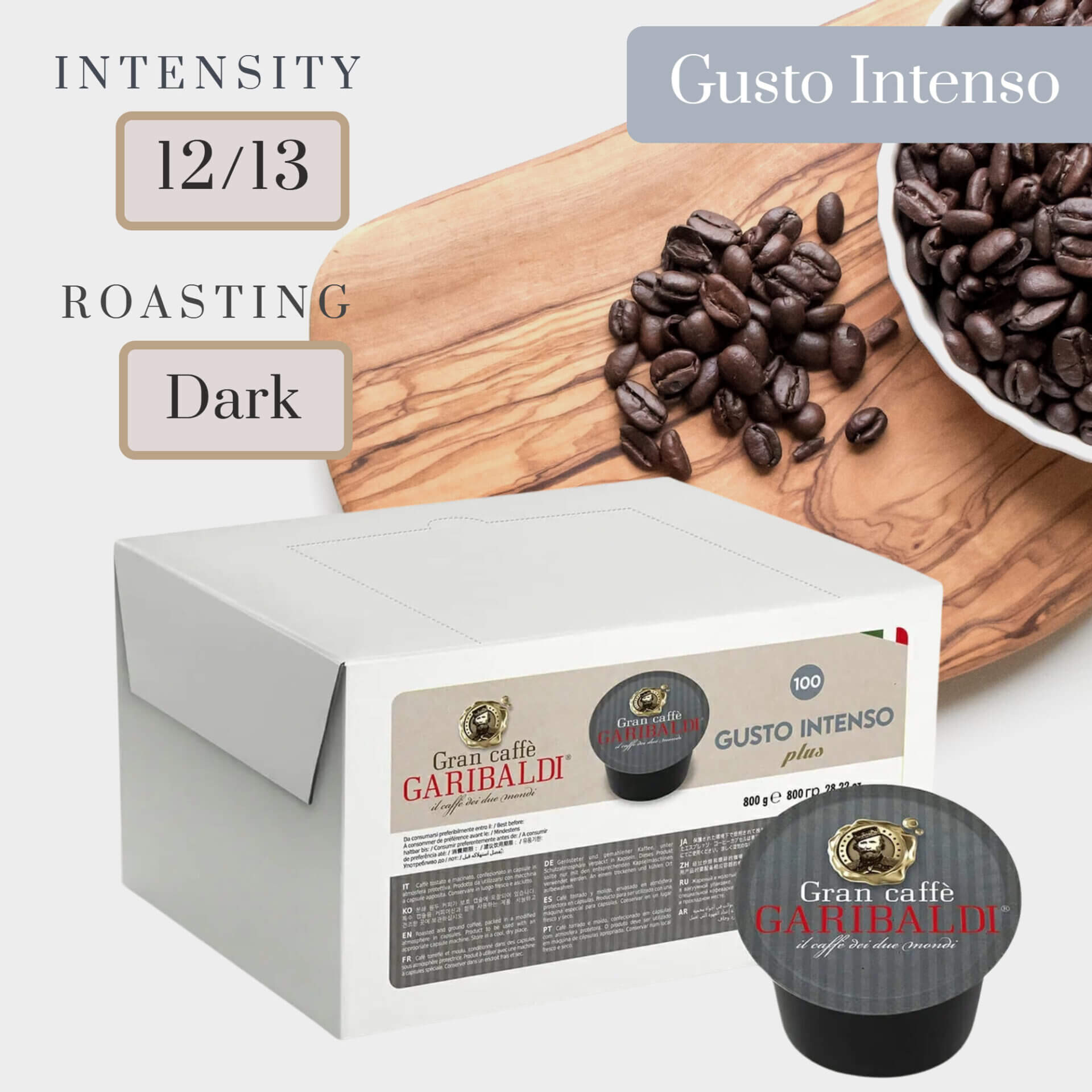 В коробке 100 капсул, предназначенных для капсульных кофемашин Lavazza Blue® для заваривания 100 чашек кофе GARIBALDI Gusto Intenso.