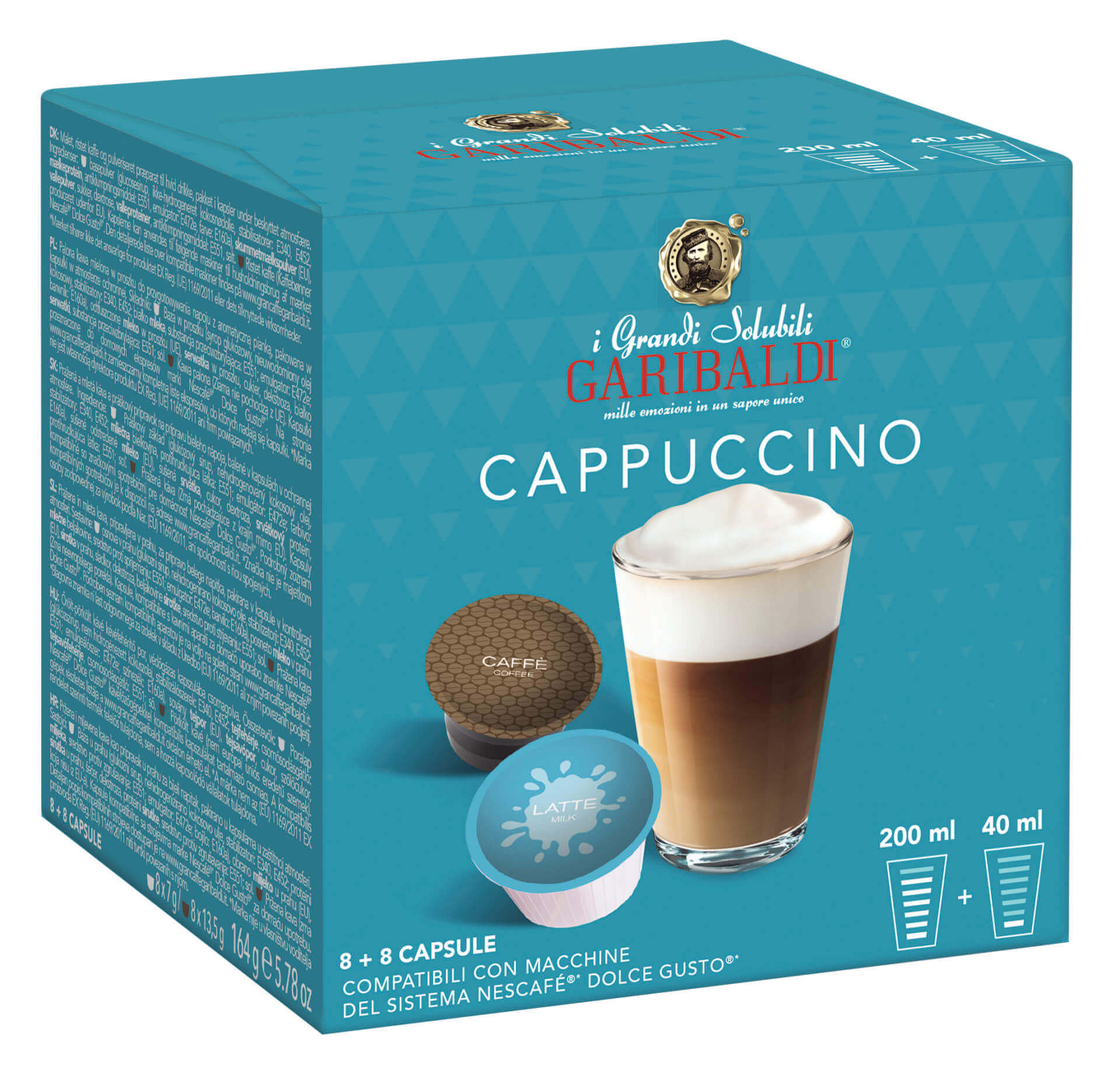 В коробке 16 капсул (8 капсул кофе + 8 капсул молока), предназначенных для капсульных кофемашин NESCAFÉ® Dolce Gusto® для приготовления 8 чашек кофе GARIBALDI Cappuccino. Кофе упакован в специальные герметичные капсулы. Таким образом, кофе сохраняет свои характерные свойства даже спустя много месяцев.